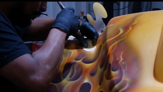 Die Aerografie ist eine Technik, bei der Farbe mittels Druckluft auf Oberflächen aufgetragen wird, um detaillierte und fein abgestufte Bilder zu erzeugen. Zunächst wird die Farbe mit speziellen Werkzeugen und Spritzpistolen vorbereitet, um die richtige Konsistenz und Viskosität zu erreichen. Anschließend wird die gewünschte Vorlage oder Schablone sorgfältig auf die Oberfläche positioniert. Nachdem die Spritzpistole mit Luft und Farbe verbunden ist, wird die Farbe sanft und präzise aufgetragen, um die gewünschten Effekte zu erzielen. Dieser Prozess erfordert Geduld, Präzision und künstlerisches Geschick, um kunstvolle und realistische Ergebnisse zu erzielen.